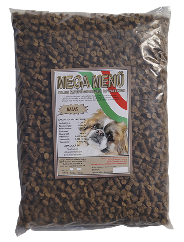 A Mega Menü Halas kutyaeledelt szárazon kell etetni.